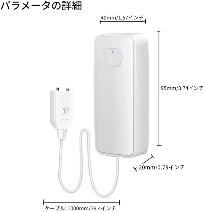 この本体のから伸びている白い線の先にふたつ出っ張っている水検知センサーがついています。このふたつのセンサーに水が触れて2極間で微小な電気が通った時に水を検知して通知を飛ばしてくれます。